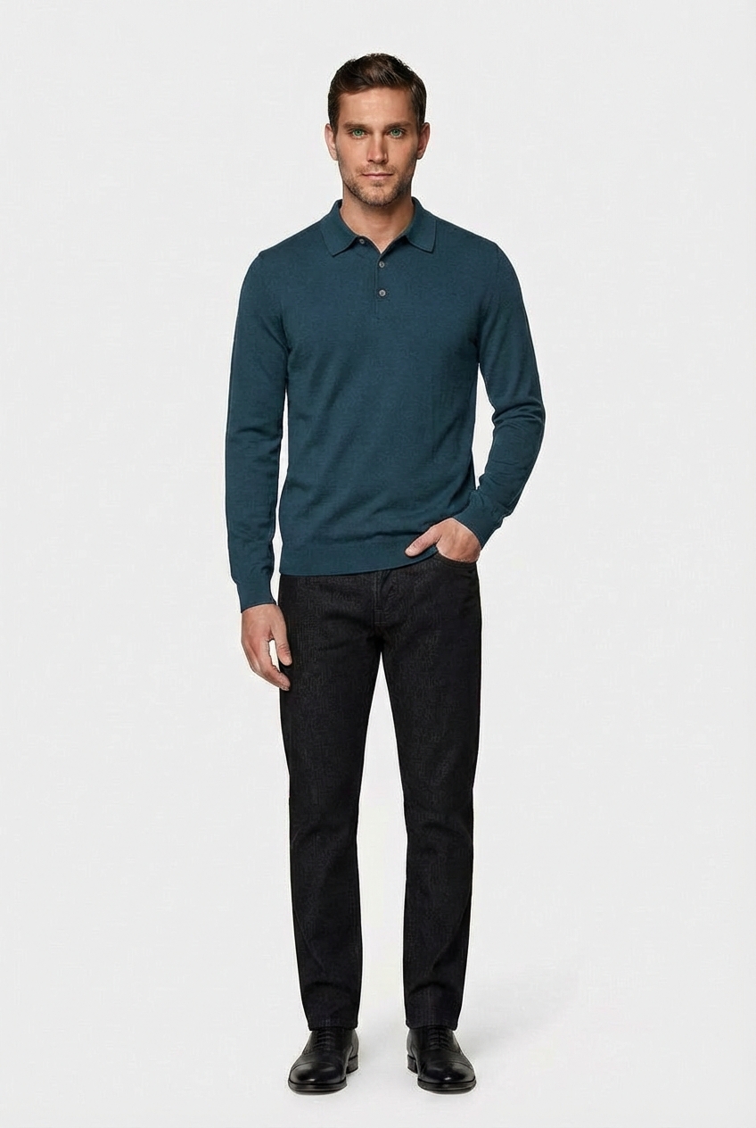• Джемпер-поло CAIOMARIO полуприлегающего силуэта из шерсти мериноса «Merino wool» это тонкая, мягкая и очень качественная шерсть. Она ценится за свои уникальные свойства, такие как превосходная терморегуляция (сохраняет тепло в холод и прохладу в жару), гигроскопичность (хорошо впитывает влагу, но быстро сохнет) и приятная на ощупь мягкость, благодаря которой она не «колется». Воротник отложной. Застежка на три пуговицы из натурального перламутра. Низ изделия и рукавов на резинке. Стильная и элегантная вещь отлично подойдет для повседневной носки.